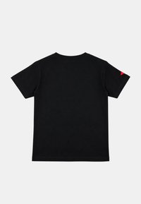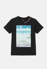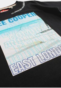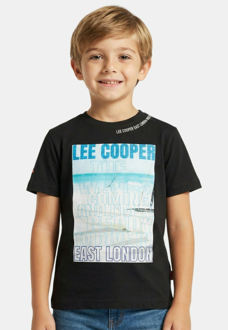 Jeune garçon souriant aux cheveux blonds portant un T-shirt noir Lee Cooper avec un motif graphique bleu et blanc sur le thème des vagues et de l'Est de Londres.