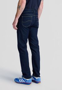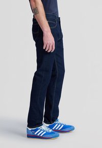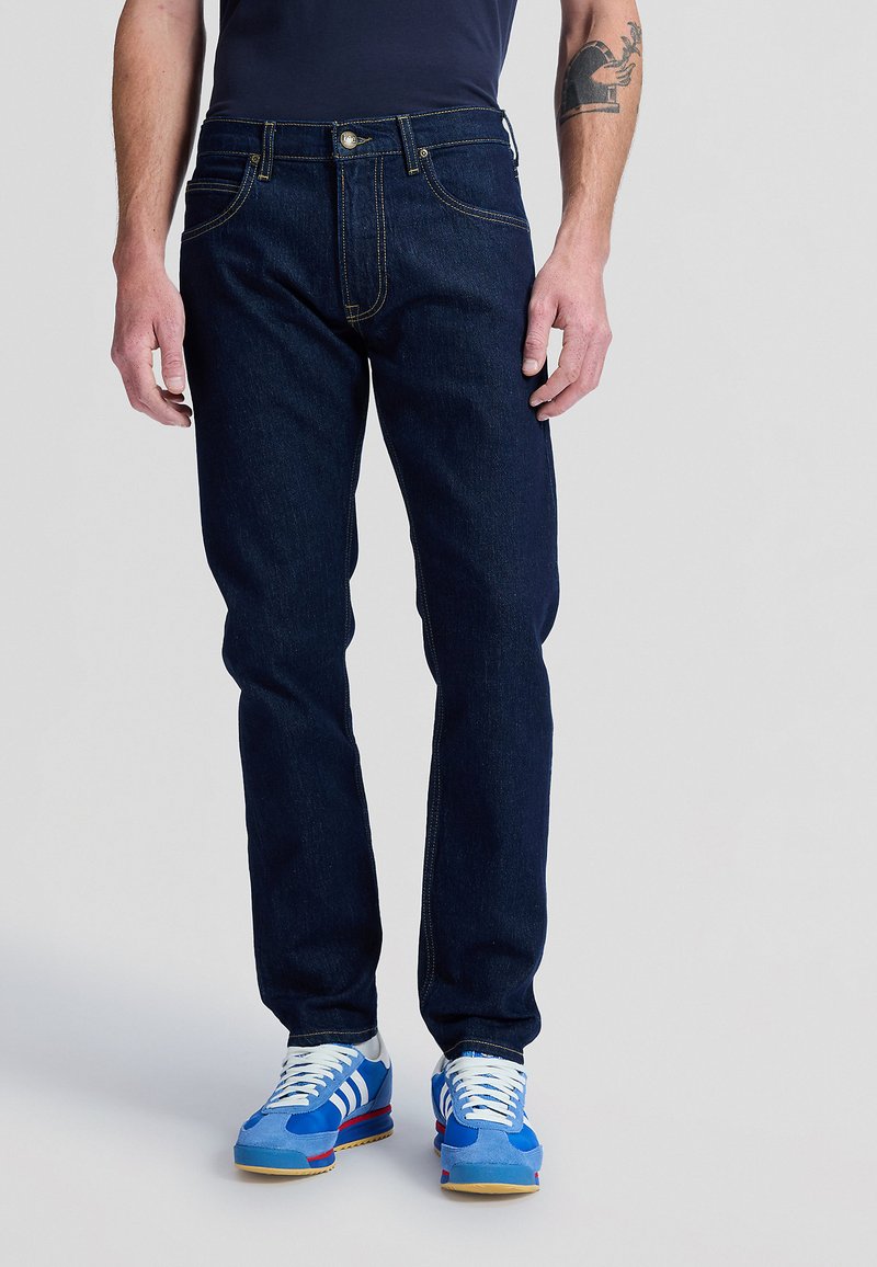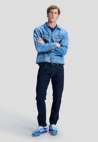 Homme portant un jean bleu foncé, une chemise bleu marine et des baskets bleues et blanches, debout devant un fond clair uni.