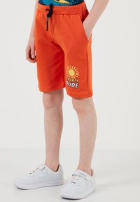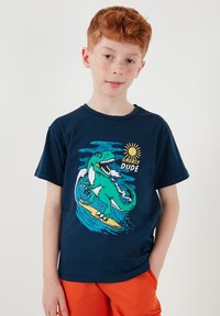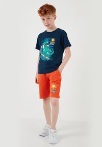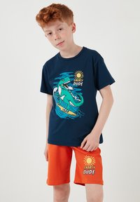 Garçon roux portant un t-shirt bleu marine avec un motif de dinosaure surfeur et un short orange avec le texte "Gnarly Dude", debout avec une main dans la poche.