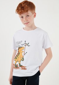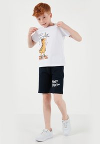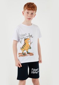 Garçon aux cheveux roux portant des baskets blanches, un short noir avec le texte « PLANET PROTECT » et un t-shirt blanc arborant un dinosaure et le design « PLANET PROTECTOR ».