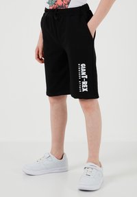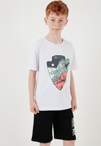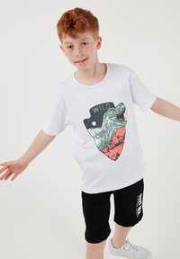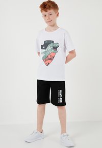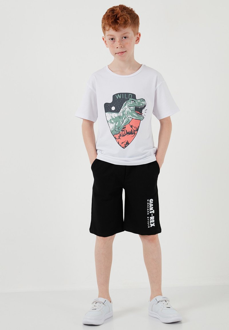 Garçon aux cheveux roux portant un t-shirt blanc avec un dessin de dinosaure et un short noir avec un texte blanc, debout les mains dans les poches et des baskets blanches.
