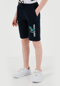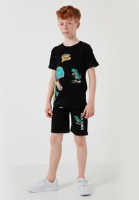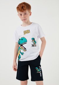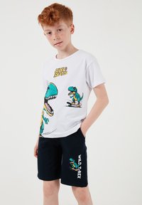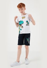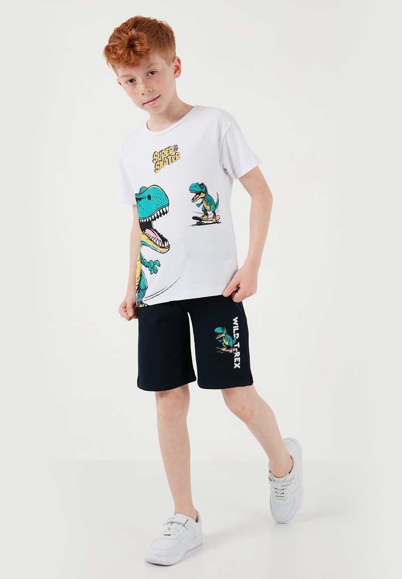 Garçon aux cheveux roux portant des baskets blanches, un short noir à imprimé de dinosaures et un T-shirt blanc avec un dinosaure faisant du skateboard et du texte.