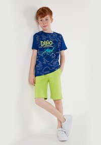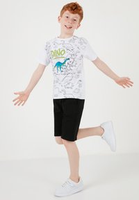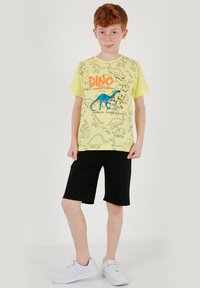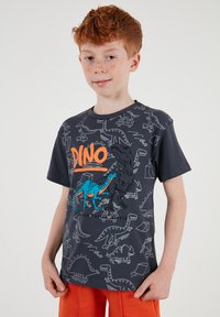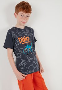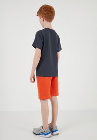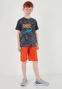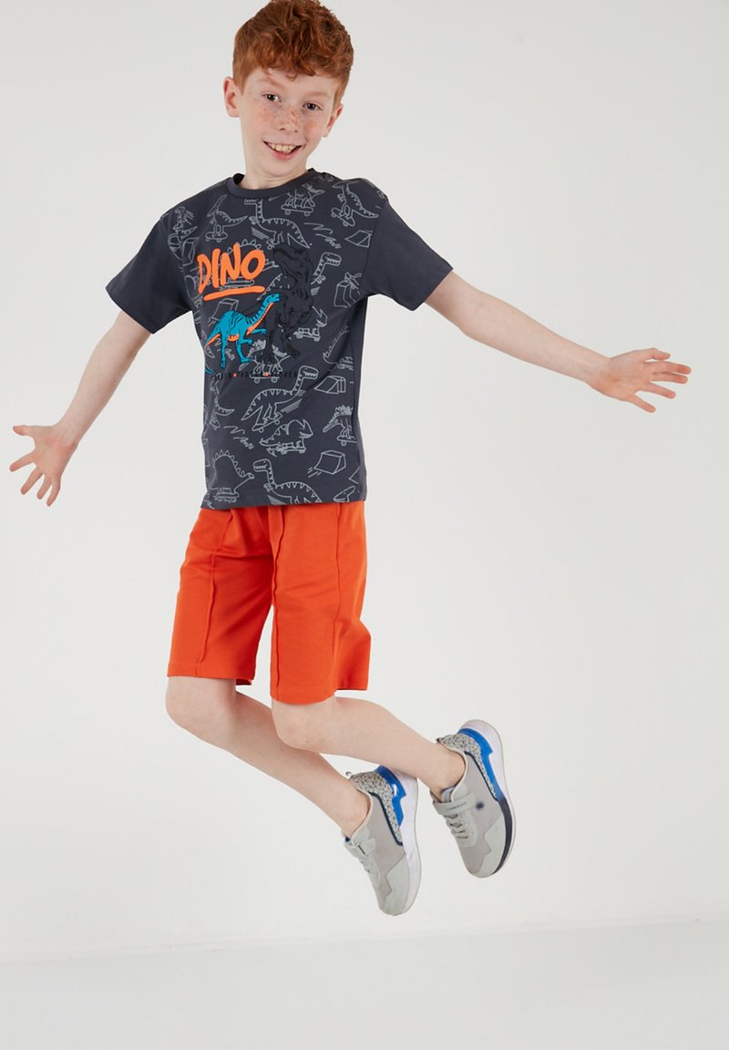 Garçon roux sautant, portant un t-shirt foncé à imprimé dinosaure, un short orange vif et des baskets grises avec des détails bleus sur un fond uni.