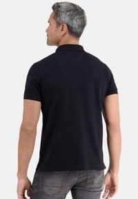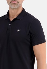 Homme portant un polo noir, un jean noir délavé retroussé à la cheville et des bottes noires, marchant avec un léger sourire sur un fond blanc.