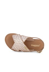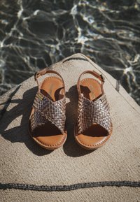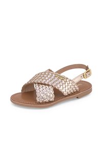 Sandales en cuir tressé doré métallisé avec des brides croisées, une bride réglable à la cheville et une semelle plate marron. Design léger.