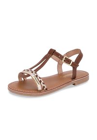 Sandales en cuir marron avec une lanière tissée, une boucle de cheville réglable, une semelle plate et un design minimaliste. Détails accentués par un logo métallique.