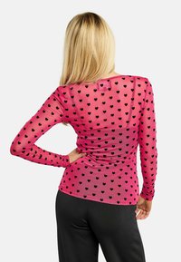 Jeune femme aux longs cheveux blonds portant un haut à manches longues rose à motifs de cœurs noirs, souriante et regardant pensivement vers le haut.