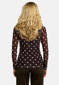 Femme souriante aux longs cheveux blonds portant un haut noir transparent à manches longues avec des pois roses et un pantalon foncé, debout devant un fond blanc.