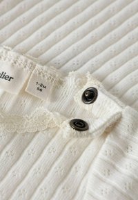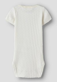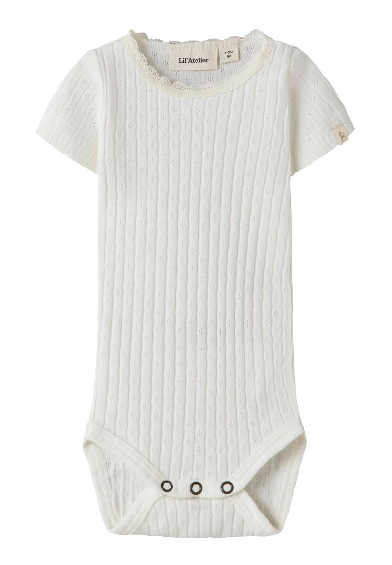 Body blanc pour bébé à manches courtes avec rayures verticales texturées, encolure en dentelle et trois pressions à l'entrejambe.