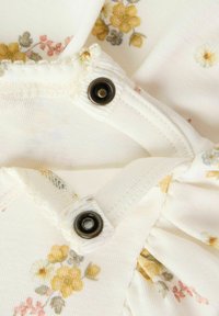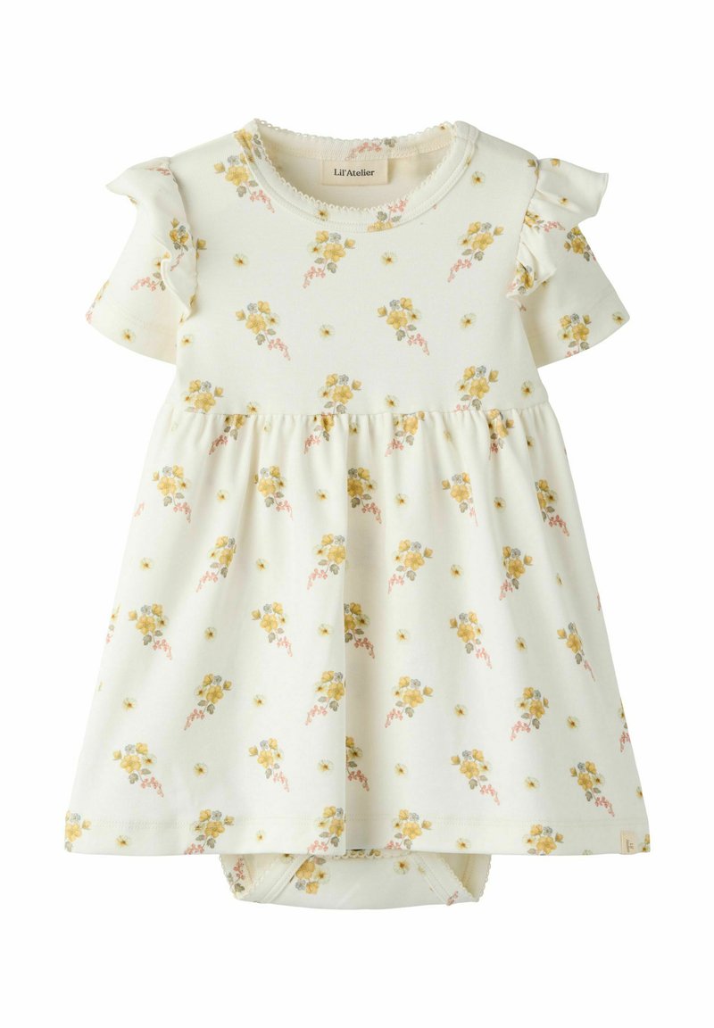 Robe bébé couleur crème avec imprimé floral jaune, manches courtes à volants et body intégré en dessous.