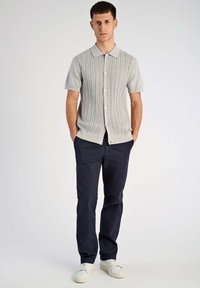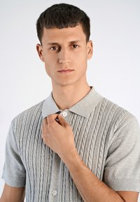 Cardigan gris à manches courtes avec une texture en maille torsadée, doté d'un col à revers et d'une fermeture à boutons. L'ourlet présente une finition côtelée.