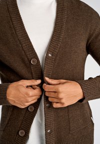 Cardigan en laine marron avec un col et des poignets côtelés, doté d'une rangée de boutons, d'une poche avant, et d'une coupe décontractée portée sur un t-shirt blanc.