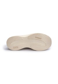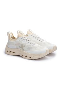 Baskets légères blanches et beiges avec dessus en mesh, semelle rembourrée à découpes circulaires, laçage avant et languette au talon.