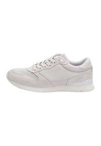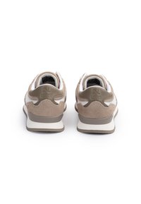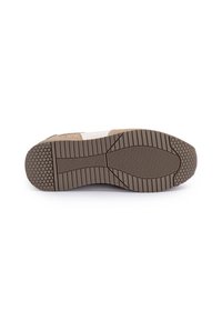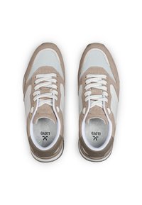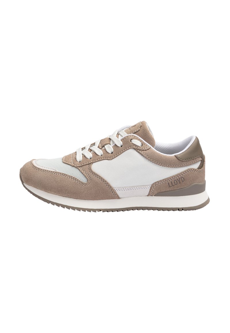 Baskets basses décontractées avec des superpositions en daim beige, des panneaux en mesh blanc et cuir, des lacets blancs, et le logo "LLOYD" sur le côté du talon.
