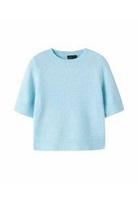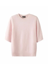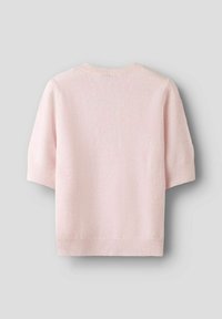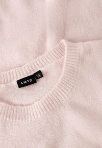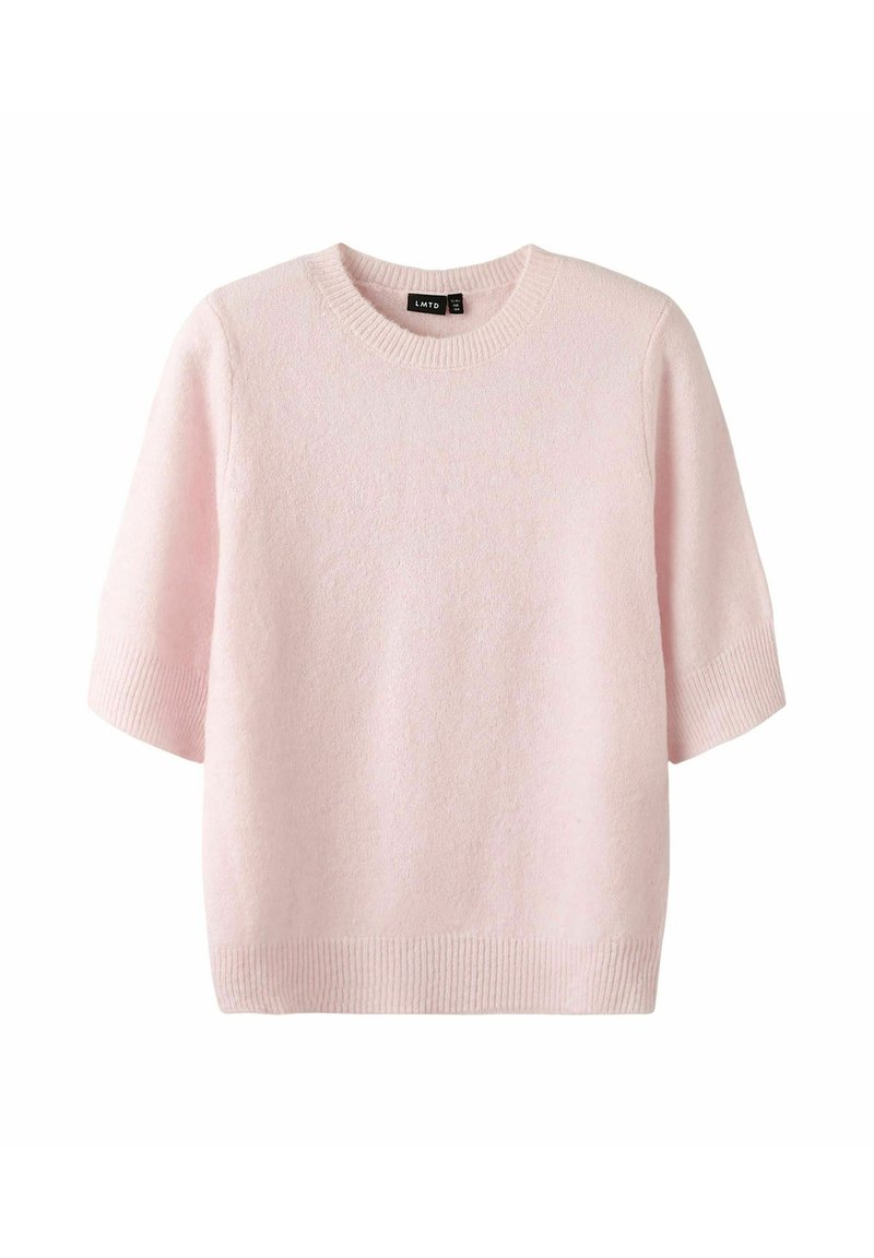 Pull en maille rose clair à manches courtes avec col rond, poignets et ourlet côtelés, fabriqué par la marque LMTD.