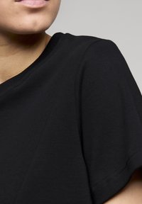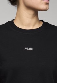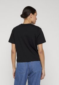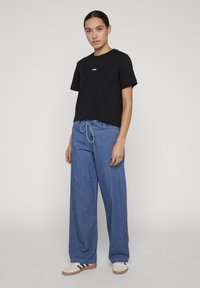 Jeune femme portant un t-shirt noir à manches courtes avec un petit logo blanc et un jean bleu taille haute avec une ceinture nouée à l'avant.