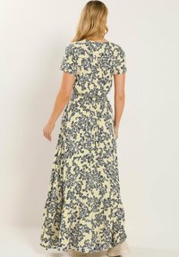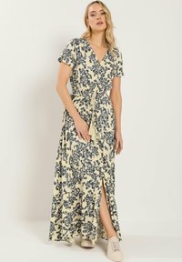 Femme portant une robe maxi crème à manches courtes, imprimé floral marine, avec une taille à cordon, debout devant un fond clair uni.