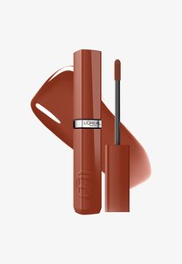 Tube de rouge à lèvres liquide mat L'Oréal Paris en teinte terre cuite chaude avec applicateur retiré, sur fond blanc.