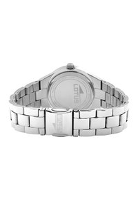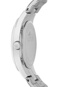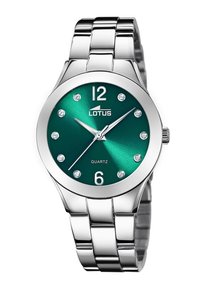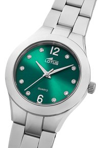 Montre-bracelet en métal argenté avec cadran vert, index en cristal et aiguilles argentées indiquant 10:09:38, de marque "Lotus Quartz".