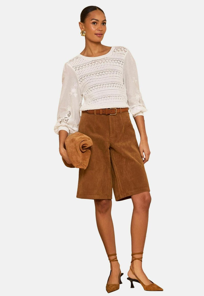 Femme portant un chemisier blanc en dentelle avec manches bouffantes, un short marron en suède avec ceinture jusqu'aux genoux, des escarpins marron à bride arrière, tenant une veste marron pliée.