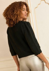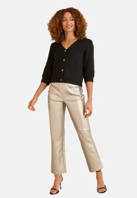 Cardigan noir en tricot avec un col en V, des manches courtes bouffantes et des boutons décoratifs avec des accents floraux. Associé à un pantalon métallique.
