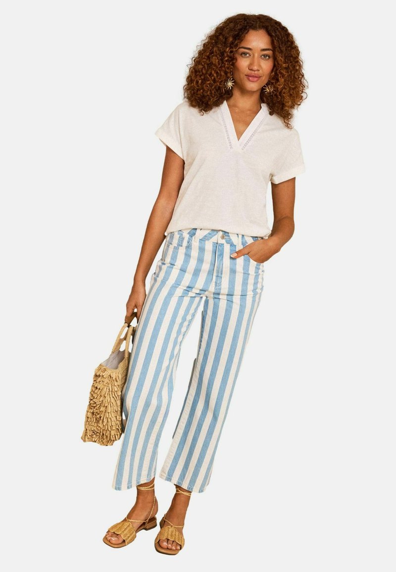 Femme portant un haut blanc à manches courtes et col en V, un pantalon large à rayures verticales bleu et blanc, des sandales marron clair et un sac tressé.