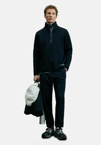 Homme portant une veste noire à demi-fermeture éclair et un pantalon, tenant un manteau plié blanc et noir, se tenant avec une expression neutre sur un fond uni.