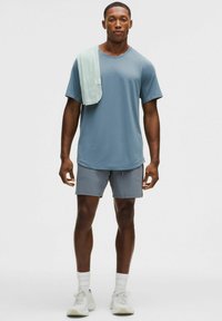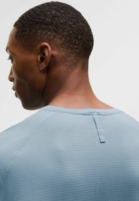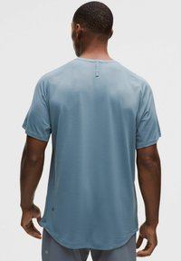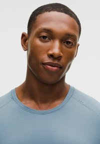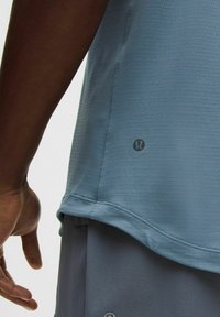 T-shirt de sport bleu clair, manches courtes, texture côtelée, col arrondi, ourlet légèrement plus long derrière, porté avec un pantalon gris.