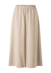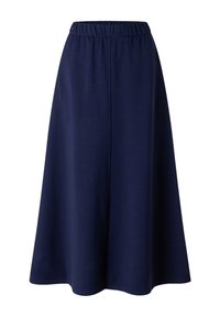 Jupe bleu marine avec une taille élastique, présentant un design évasé en A et une texture lisse et douce. Pas de matériel ou de motifs visibles.