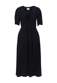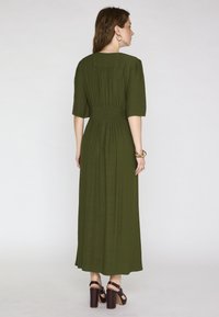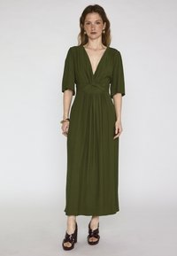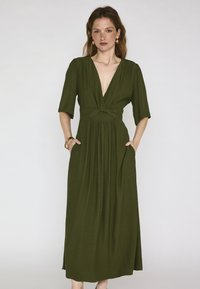 Femme portant une longue robe vert olive avec un profond décolleté en V, des manches mi-longues et des poches latérales, debout devant un fond uni.
