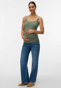 Femme enceinte portant un débardeur vert, un jean bleu et des ballerines marron, debout avec les mains posées délicatement sur le ventre, sur fond blanc.