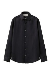 Homme portant une chemise sombre à manches longues boutonnée, manches retroussées, et un pantalon de couleur claire, debout les mains dans les poches.
