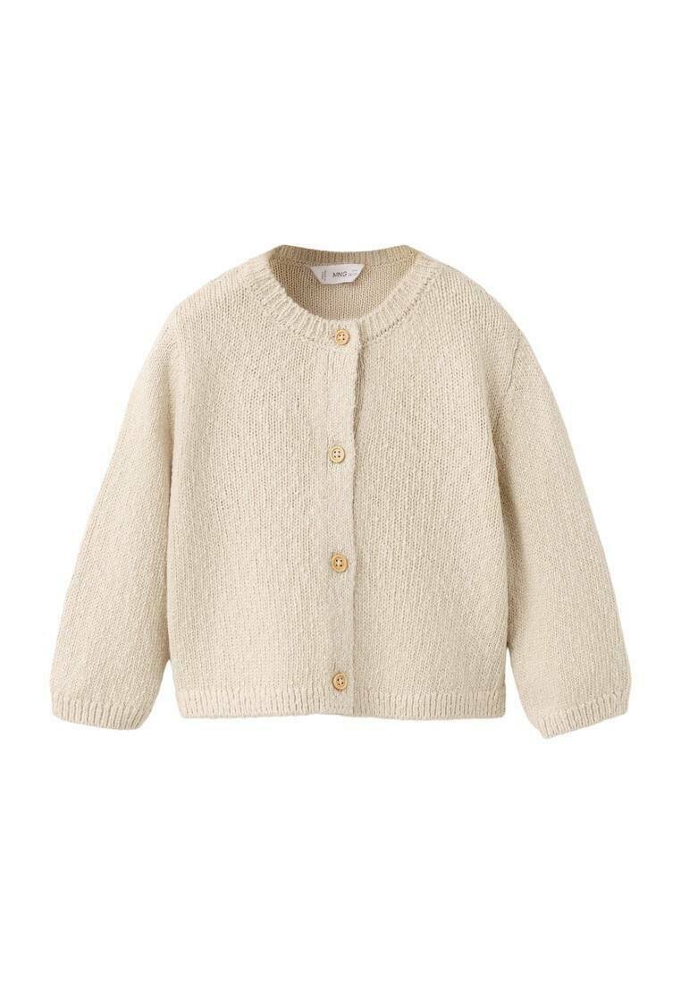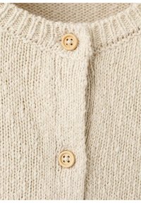 Cardigan beige en maille avec manches longues et quatre boutons en bois sur le devant, présentant un col rond.
