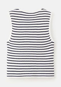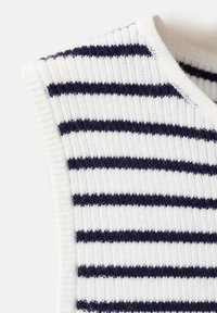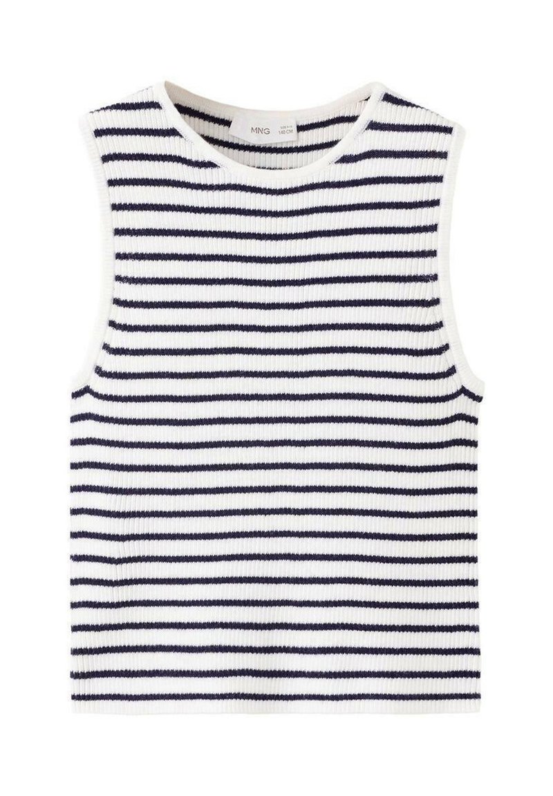 Haut sans manches en maille blanche avec des rayures noires horizontales, un col rond, une texture côtelée et une étiquette de taille au col.