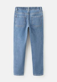 T-shirt blanc à manches longues avec une poche, associé à un jean bleu clair et des baskets grises avec des rayures vertes. Design simple et coupe décontractée.