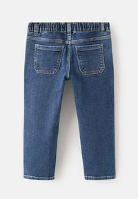 Garçon blond debout, jambes écartées, portant une chemise bleu clair boutonnée, un jean bleu et des chaussures marron à lacets, regardant vers le bas.