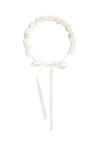 Bandeau floral blanc avec des fleurs en tissu délicates et des rubans en dentelle noués qui pendent.