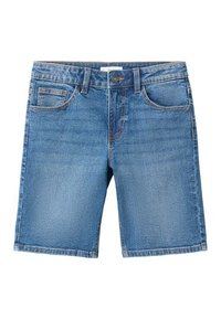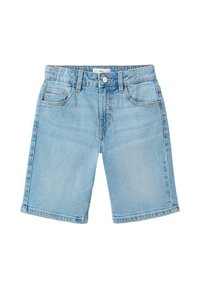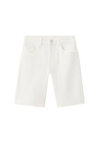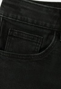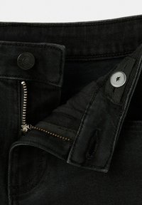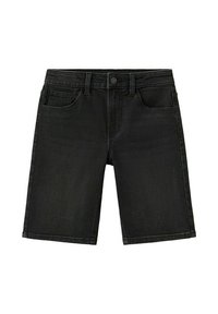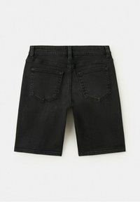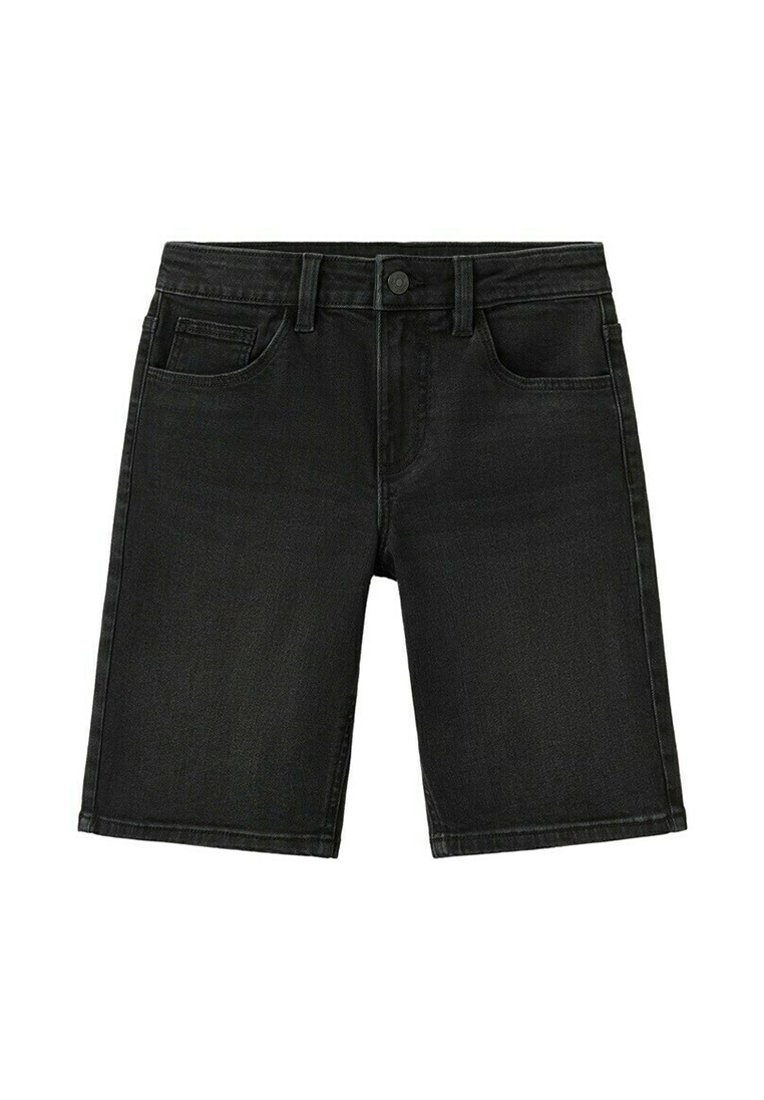 Shorts en jean noir avec bouton sur le devant, passants pour ceinture et design à cinq poches, présentés à plat sur un fond blanc.