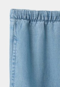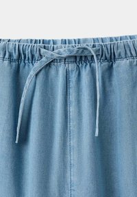 Culottes en denim bleu clair avec une taille élastique, un cordon de serrage et des jambes larges et cropped. Présente des coutures latérales avec une finition propre.