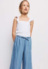 Jeune fille aux cheveux blonds portant un haut blanc sans manches avec des bretelles froncées et un pantalon ample en jean bleu à taille élastiquée avec cordon.