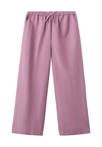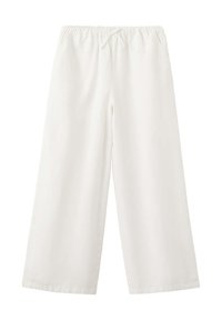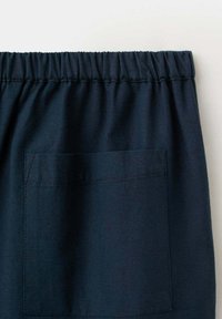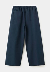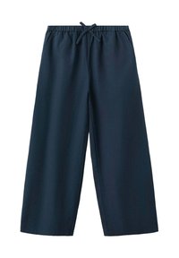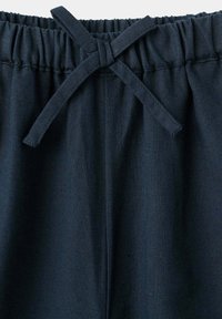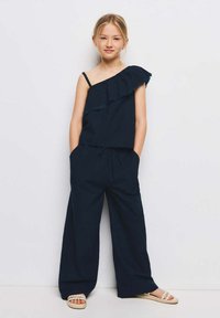 Jeune fille debout contre un mur blanc, portant un top asymétrique à volants bleu marine, un pantalon large et des sandales blanches avec des brides tressées.