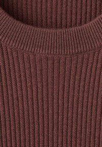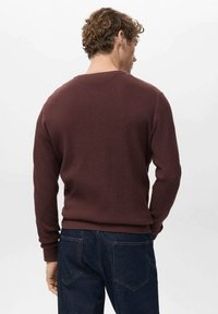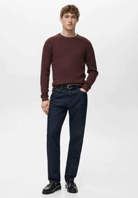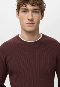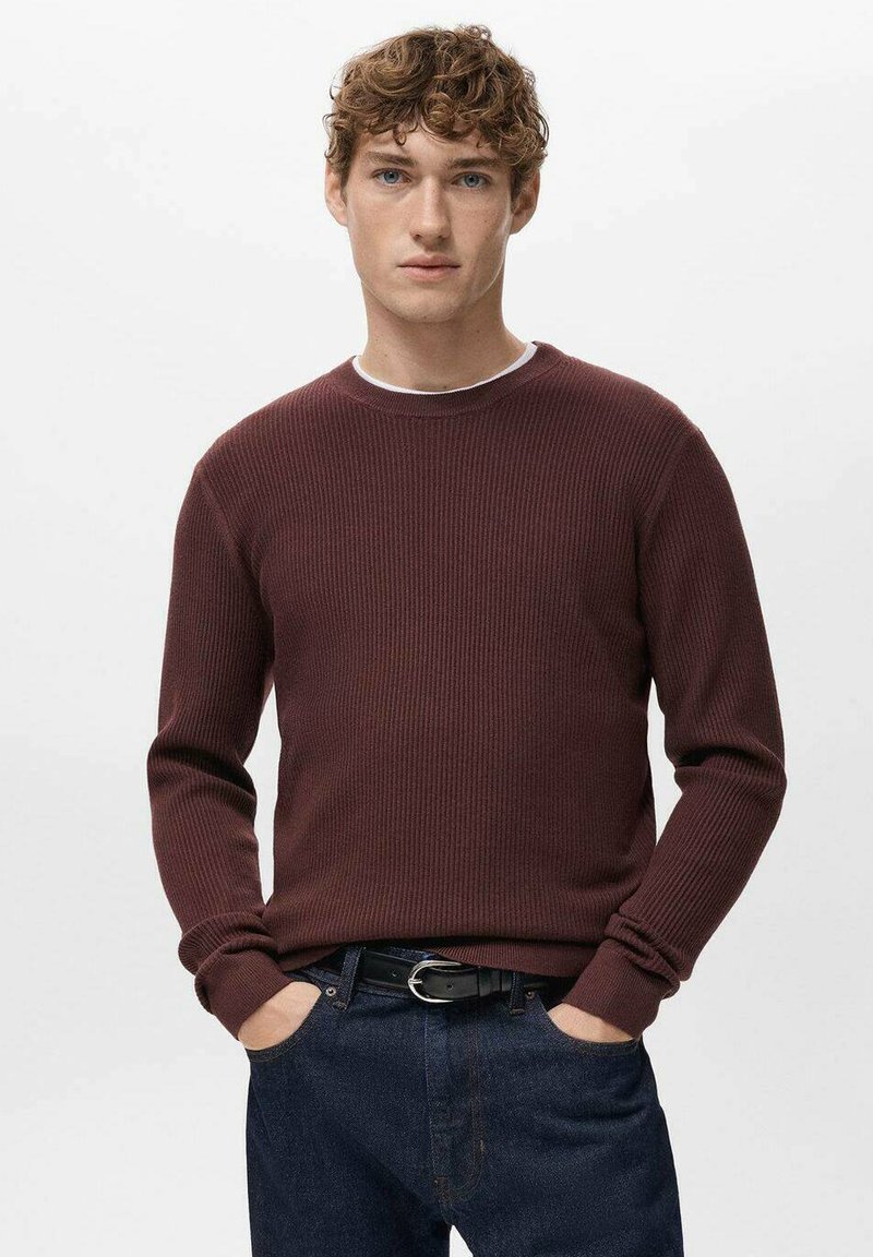 Pull côtelé marron avec un col rond et des manches longues, associé à un jean denim bleu foncé. La texture est douce et tricotée.