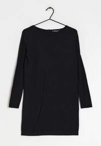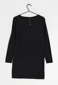 Robe noire à manches longues en tissu doux, avec un col rond, une coupe droite et des poignets ourlés. Accrochée à un crochet noir.