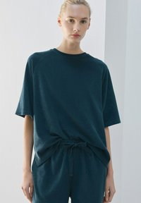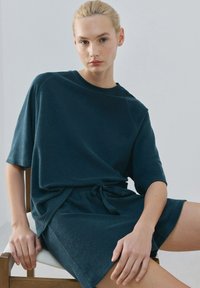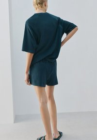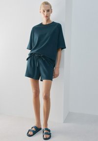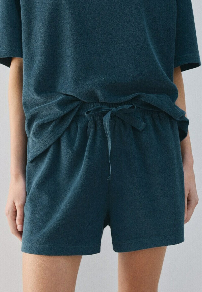 Shorts en éponge bleu sarcelle foncé avec taille élastique et cordon de serrage, portés avec un haut assorti à manches courtes et ample.