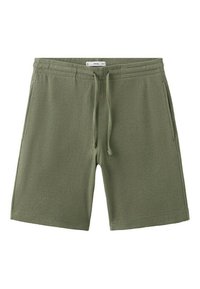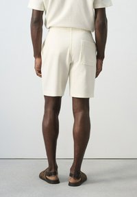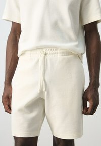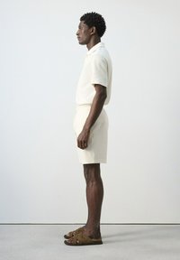 Homme portant un short texturé blanc cassé avec taille à cordon de serrage, un haut à manches courtes assorti, et des sandales marron croisées, debout sur un sol gris.