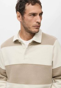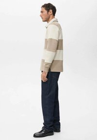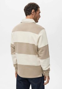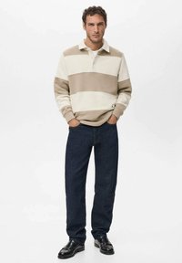 Polo à manches longues rayé beige et crème avec un col, comportant trois boutons et des poignets côtelés, accompagné d'un jean foncé.