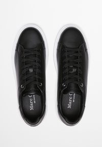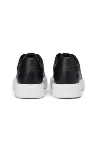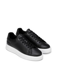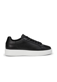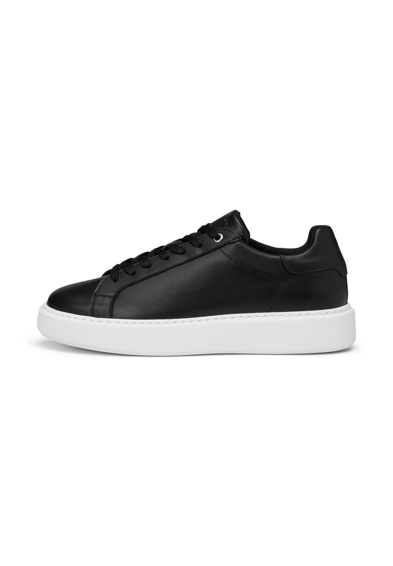Baskets basses noires avec une semelle blanche épaisse et des lacets noirs, vues de côté sur un fond blanc.