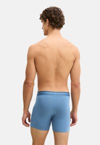 Homme torse nu aux cheveux bouclés portant un boxer bleu Marc O'Polo, debout devant un fond clair uni.