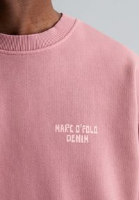Homme portant un sweat-shirt rose avec un grand texte "PINEAPPLE" en rose clair et un texte plus petit "MARC O'POLO DENIM" au dos, tourné vers l'arrière.