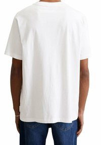 Homme portant un t-shirt blanc Marc O’Polo Denim et un jean bleu, accessoirisé avec un collier chaîne en argent et un bracelet.
